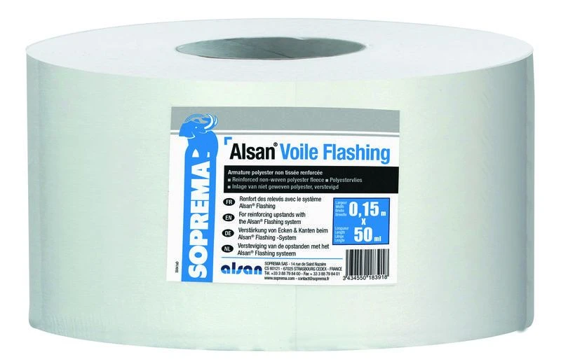 ALSAN® VOILE FLASHING® est une armature souple, élastique et facile à mettre en œuvre, destinée au renfort de relevés et au pontage raccord de tôle.