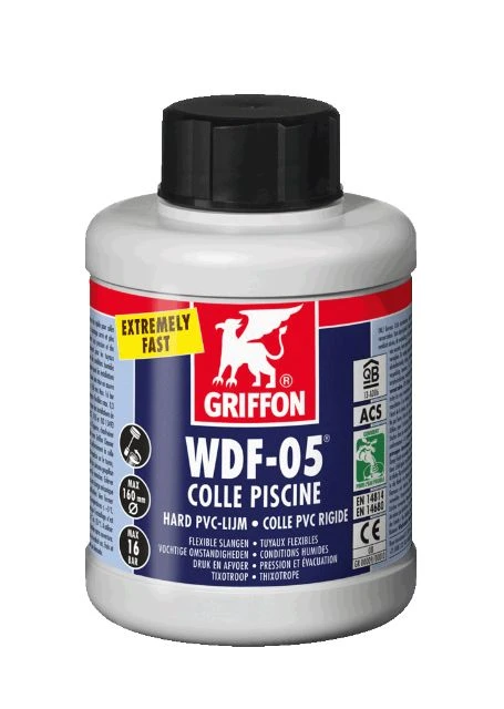 Mise en oeuvre : 1. Scier les tuyaux à l’équerre, chanfreiner et ébavurer. 2. Nettoyer les surfaces à coller avec Griffon Cleaner et Cleaner Cloth. 3. Appliquer rapidement et uniformément la colle tout autour (4 à 6x) des deux surfaces à coller (couche épaisse sur le tuyau, couche fine dans le manchon). 4. Emboîter directement le manchon. Enlever l’excès de colle. Ne pas soumettre l’assemblage à une charge mécanique pendant les 10 premières minutes. Fermer correctement l’emballage immédiatement après utilisation.