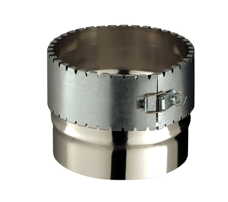 Raccord venant se fixer à l’extérieur du flexible en partie basse à l’aide d’un collier a griffes. Il permet le raccordement avec les conduits Inox Poujoulat simple paroi. Produit commun gamme : kitinox et tubage flexible