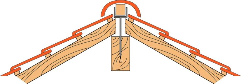 Conseils Pro. : Le support de faîtage RB permet de remplacer les lisses de rehausses nécessaires à la ventilation de toiture. Il se cloue directement sur la poutre faîtière, ce qui facilite le réglage final.