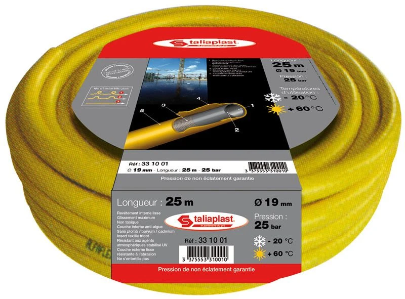 Tuyau PVC 5 couches. Ne s’entortille pas. Revêtement interne lisse : glissement maximum, non toxique. Couche interne anti-algue, sans plomb / baryum / cadmium. Insert blanc. Résistant aux agents atmosphériques et stabilisé UV. Couche externe lisse résistante à l’abrasion. Pression : 25 bars. Diamètre : 19 mm. Longueur : 25 m.